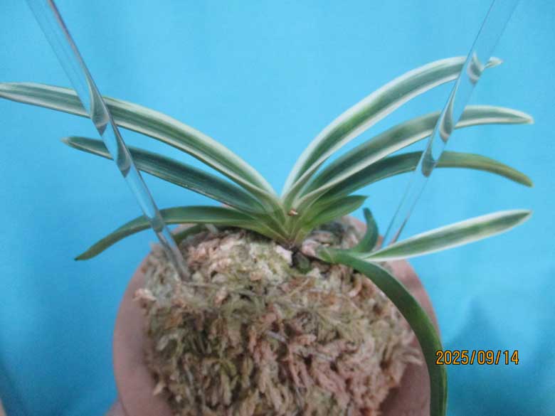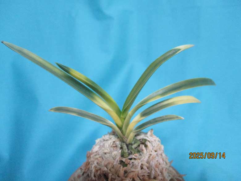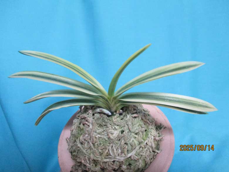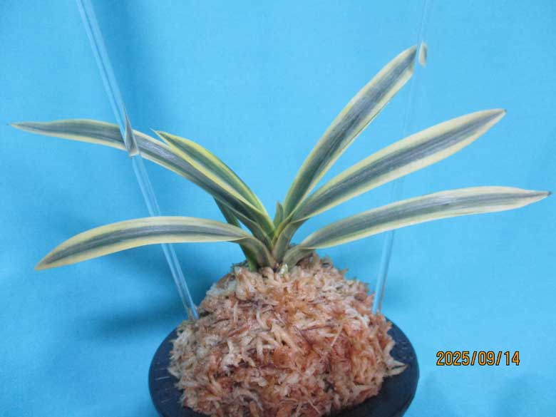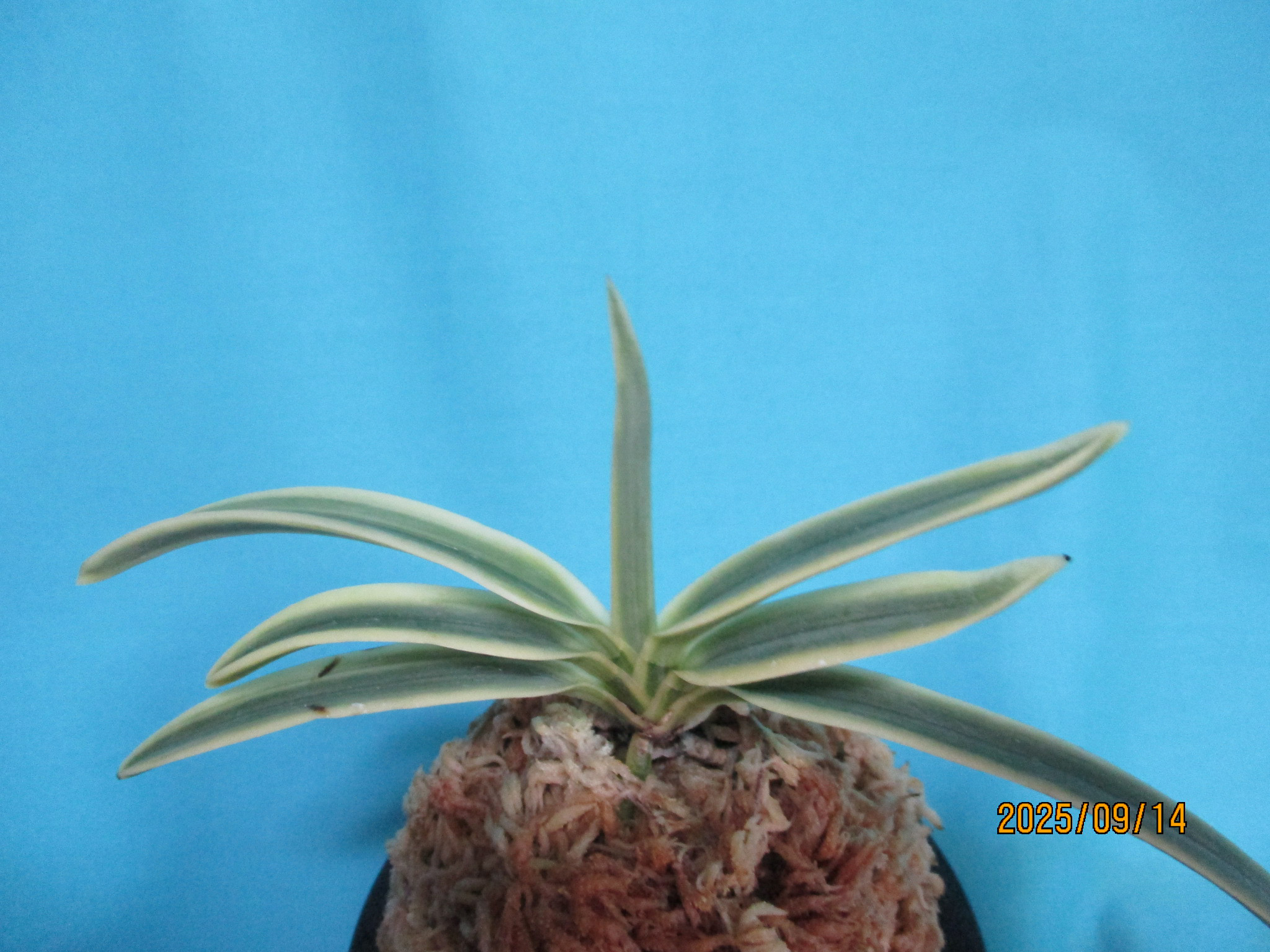 2本仔付。4~5,5cm前後葉。中小仔付。葉姿のいい白黄色縞の最上柄と言っていいです。中仔もいい芸で小仔も縞は見えます。