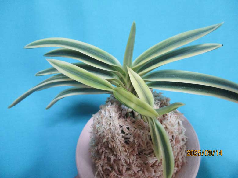 6本仔付。5,5~7,5cm前後葉。大3中1小2本仔付。葉肉のある中型木。美しい黄色虎斑が全般に入っています。